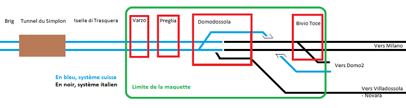 La maquette représente la ligne du sud Simplon entre Varzo et Bivio-Toce sur la commune de Beura-cardezza en passant par les gares de Preglia et Domodossola. A Domodossola la ligne se partage en 3 : une ligne principale vers Bivio Toce (- Milano), une ligne marchandises vers la gare de triage de Domo 2 et une ligne à voie unique direction Villadossola (- Novara). Bivio Toce est une bifurcation permettant de rejoindre également la gare de Domo 2