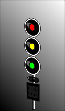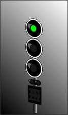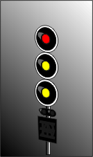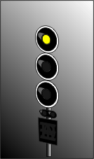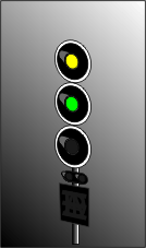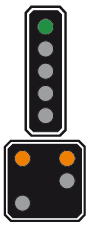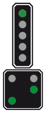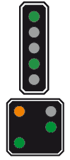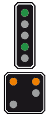 Le 1er signal, au lieu d'être vert, est jaune clignotant car la distance pour freiner est trop courte entre le 2ème et le 3ème signal |
